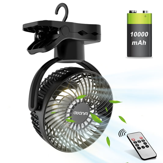 AWANFI 10000mAh Battery Operated Oscillating Fan with Remote, Rechargeable Camping Fan with LED Light, 4 Speeds, Power Bank, Hanging Hook, Clip On Fan for Tent, Desk, Stroller, Camping, Office, Home