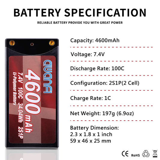 AWANFI 2S Shorty Lipo 7.4V 4600mAh 100C Hardcase Lipo Battery with Deans Plug for 1/10 Scale RC Cars (2 Pack)