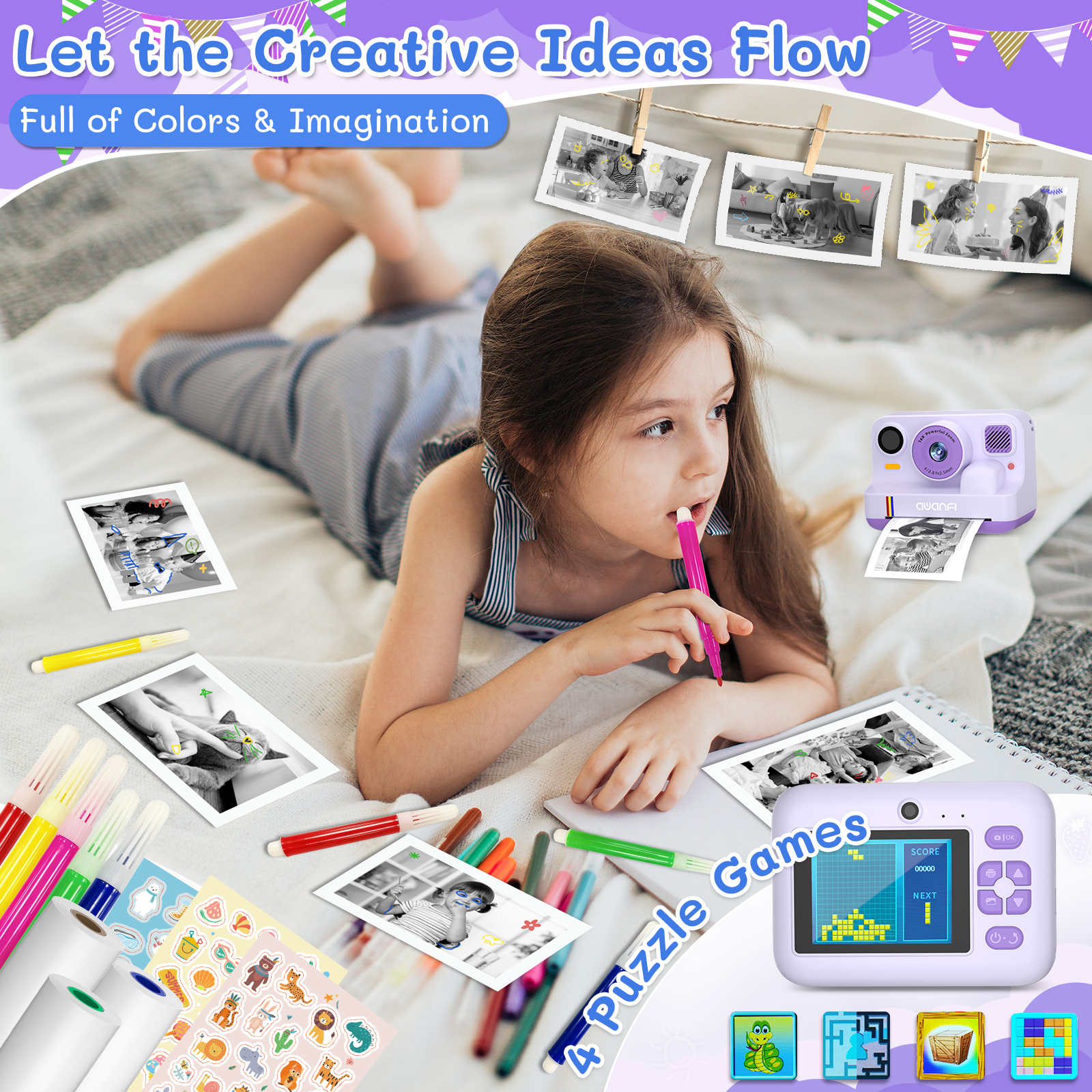 - 💗AWANFI Instant Print Camera Kids: Support Kid's hobbies and let them learn photography knowledge while playing, Keeps Yours kids Busy, Whether it's for a special occasion like birthdays, Christmas_, or just a simple visit, this toys for toddlers is sure to impress both boys and girls.