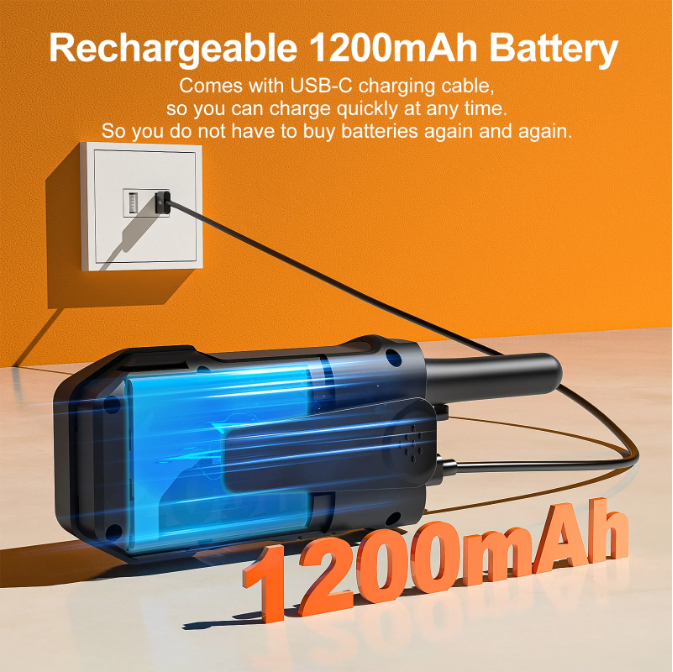 - Rechargeable Battery: Built-in 1200mAh lithium battery with USB-C charging, allowing simultaneous charging of two walkie talkies for convenience.