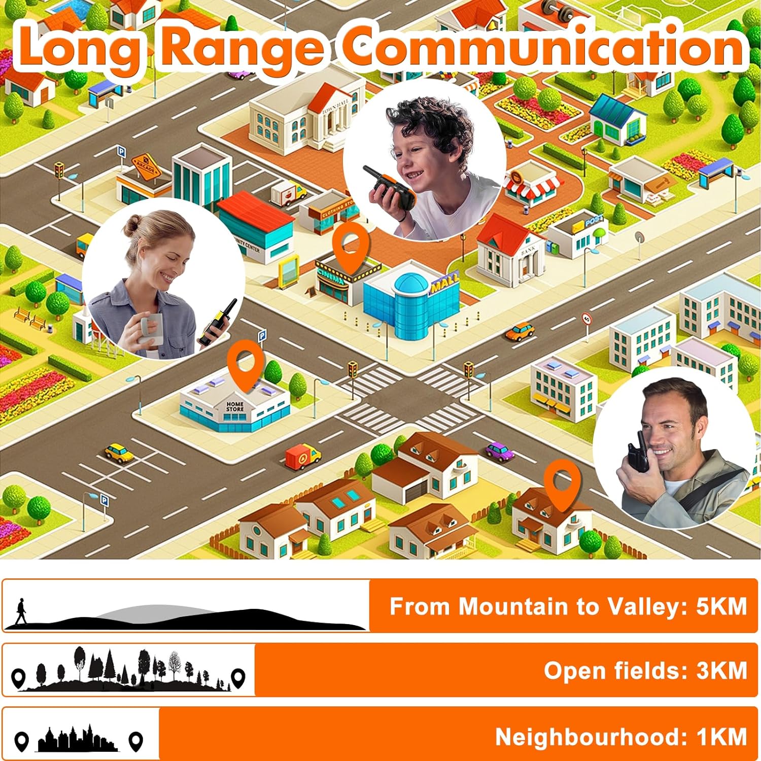 - Long Range Two Way Radios - Up to 3 km in open fields (subject to terrain and conditions)