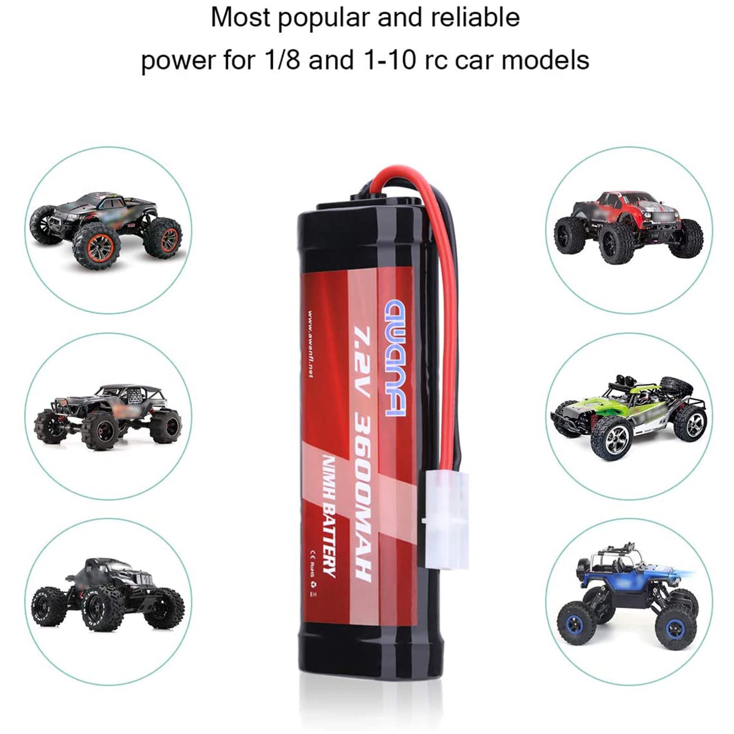• Enhanced Performance: Low resistance welded connections between each cell and thick 14AWG silicone power wires ensure maximum performance. Additionally, each AWANFI 7.2V NiMH battery comes with a standard Tamiya-style connector.