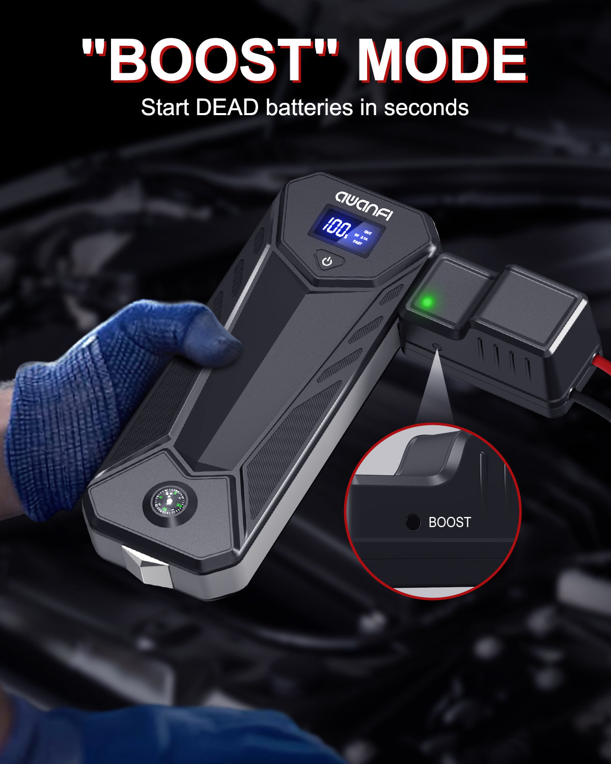 - [ Ultra-Effective Jump Starter ] Experience true control with our Jump Starter Battery Pack. Simply press the "BOOST" button to command your car's instant restart. Eliminate the need for external help or expensive roadside services. Our jump starter puts the power back in your hands. It can also start trucks, motorcycles, snowmobiles, ATV, UTV, lawnmowers, and even yachts in seconds.