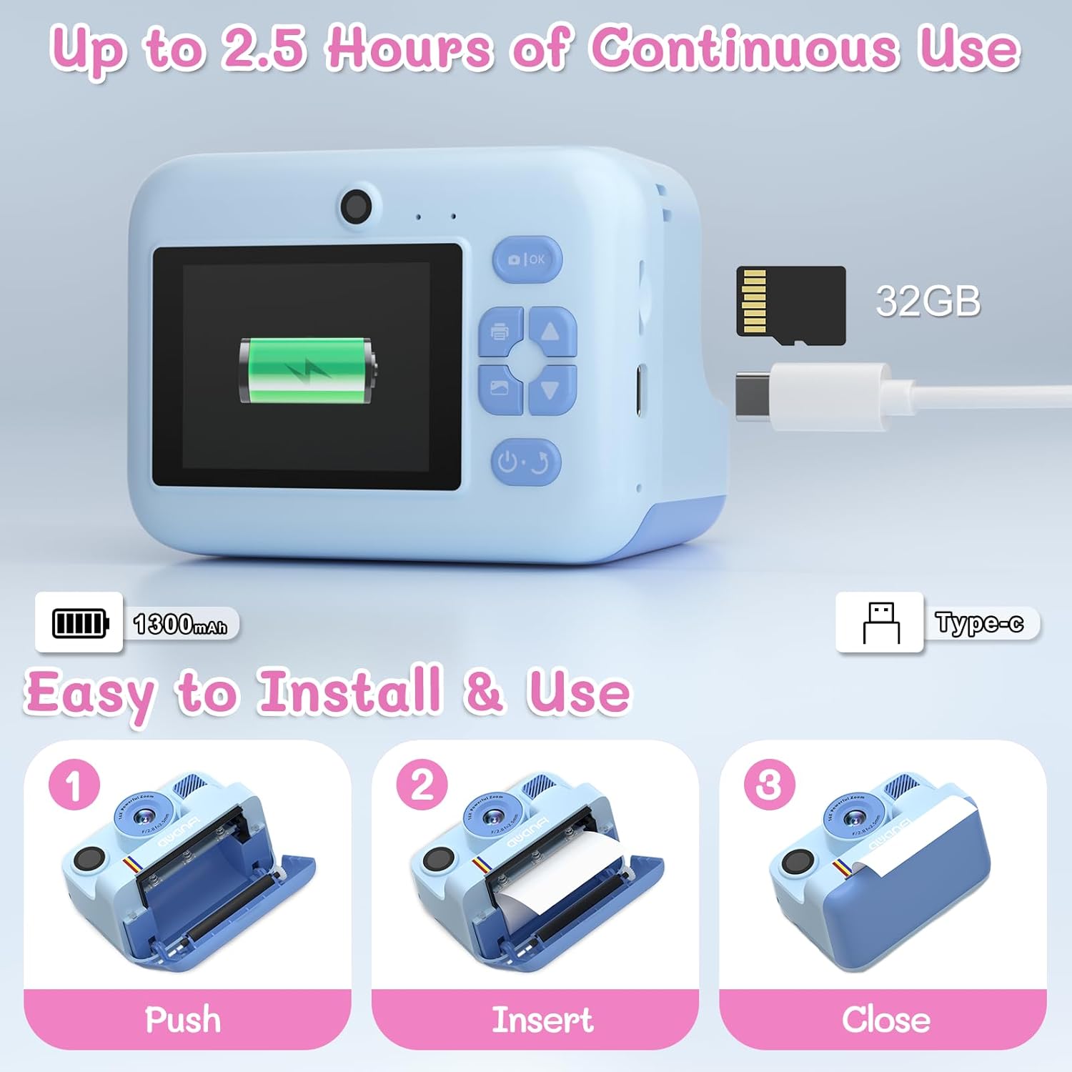 - 🔋 【Long Battery Life & Large Storage】 Equipped with a 1300mAh rechargeable battery, this kids instant print camera supports up to 2.5 hours of continuous use. The pre-installed 32GB SD card stores thousands of photos and videos, allowing kids to shoot and print freely. Lightweight, durable, and shockproof, with a lanyard design, it’s ideal for both indoor and outdoor adventures.